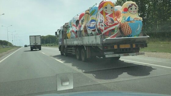 Груженый огромными куклами грузовик привлекал внимание участников дорожного движения. По дороге из аэропорта Курумоч в Самаре балаковец Максим Долгов увидел необычный автомобиль. Открытый кузов был полностью заставлен гигантскими матрешками. «Прилетев в Россию, по дороге из аэропорта, я понял, что дома», — написал в социальной сети «ВКонтакте» автор необычного снимка. Знающие пользователи подсказали, что матрешки — с Чемпионата мира по футболу, которые увозят со стадиона Самары, где проходили игры мундиаля. Фото: Максим Долгов