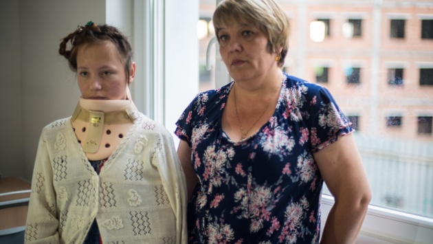 Студентка из Забайкалья прилетела в Новосибирск, чтобы вылечить ужасную травму шеи, — она сильно пострадала в ДТП из-за полена, попавшего под колёса «Хонды». Хирурги закрепили повреждённые позвонки специальными винтами. На этой неделе врачи федерального центра нейрохирургии готовятся выписать 19-летнюю Анастасию Бойченко, которой сделали сложную операцию. Ради неё студентка вместе со свекровью прилетела из Читы. Авария, в которой сильно пострадала Бойченко, случилась вечером 7 августа у деревни в Забайкальском крае — за рулём новой «Хонды» был 25-летний муж девушки, сама Анастасия сидела на переднем сиденье и была пристёгнута. «Мы купили машину, и они поехали кататься. [На пути обратно] налетели на полено с сучком, оно попало в колесо, разорвало колесо, и их начало крутить. Сын у меня тоже был без сознания. По его рассказам, он очнулся, отстегнул — вытащил Настю, вызвал скорую», — рассказала свекровь пациентки Елена Казанцева. Её сын получил лёгкие ушибы, в отличие от невестки: Анастасия Бойченко получила опасную травму шеи. Свекровь девушки подчеркнула, что сын вёл машину трезвый, — попавшее под машину полено было случайностью. По словам Казанцевой, в момент аварии сработала и подушка безопасности — но из-за неё девушку и придавило к подголовнику сидения, и она повредила шею. «Она лежала в реанимации (районной больницы. — М.М.), потом её по санавиации отправили в Читу, там она в реанимации была Потом нам сказали, что в Чите не смогут сделать такую операцию», — отметила свекровь. Скорая помощь привезла девушку в аэропорт Читы, до Новосибирска она долетела лёжа. Здесь, в Новосибирске, её также встретили медики и отвезли в нейроцентр. «[Пациентка] получила сочетанную травму — черепно-мозговую травму и травму верхнего шейного отдела позвоночника, которая является весьма серьёзной, потому что в этой зоне находится очень много жизненно важных образований. Девочке в какой-то степени повезло — травма самого спинного мозга была не сильно серьёзной, и не пострадали позвоночные артерии. Потому что если на этом уровне происходит серьёзная травма самого спинного мозга, то, как правило, эти пострадавшие до приезда скорой помощи не доживают. Особенность хирургического лечения в этом случае заключается в том, что нужно зафиксировать между собой повреждённые позвонки и сделать это так безопасно, чтобы не пострадал ни сам спинной мозг, ни позвоночные артерии, которые здесь находятся», — объяснил заведующий спинальным отделением центра нейрохирургии Владимир Климов. Зафиксировать позвонки удалось с помощью специальных винтов — они остаются в организме пациента навсегда и, по словам врачей, безопасны для человека. Сама Анастасия Бойченко говорит, что до операции чувствовала очень сильную боль в шее и в голове и что она не могла ходить. Сейчас ей уже лучше, хотя разговаривать всё ещё непросто. Во время лечения она буквально училась садиться и ходить заново. Около полугода ей нужно будет ограничивать себя в физической нагрузке и ходить в воротнике, но в дальнейшем, по словам врачей, никаких противопоказаний у неё не будет — тем более что Бойченко планирует стать преподавателем физкультуры. Ранее врачи-травматологи наглядно показали НГС, как собирают кости и мышцы заново и скрепляют их гвоздями и шурупами. В перерывах между операциями врачи 