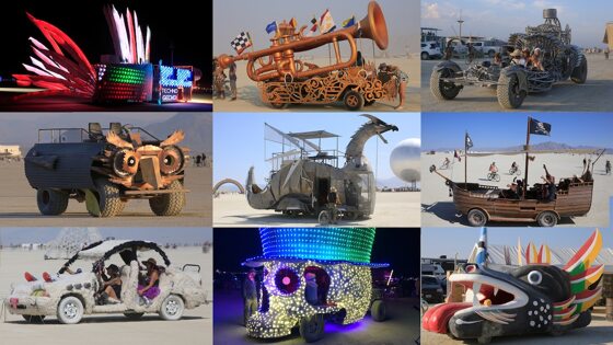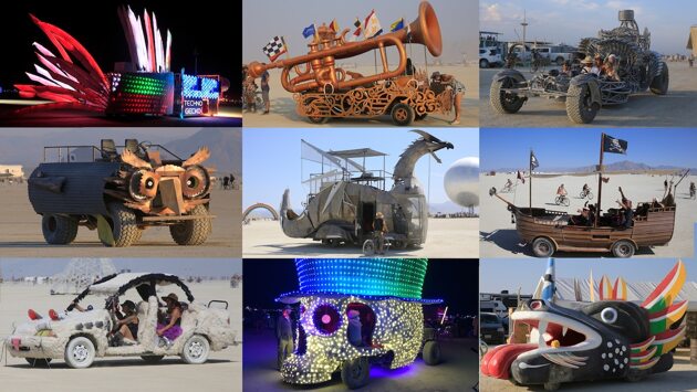 Каждый год 80 000 человек превращают пересохшее озеро Блэк Рок в Северной Неваде в один из самых крутых и тесных городов мира. Занимая площадь в 18 квадратных километров - треть Манхэттена - временный мегаполис заполняется домами на колесах, палатками, фанерными домиками и произведениями искусства, иногда весьма дикими, которые привозят сюда творческие личности со всего света. Burning Man становится временным пристанищем и для сотен странных и прекрасных автомобилей, превратившихся в арт-объекты самых причудливых форм. Там можно найти что угодно - от миниатюрных двухместных на базе гольф-каров, до гигантских кораблей, способных перевозить целую вечеринку. Чтобы стать настоящим mutant vehicle оригинальное шасси должно быть невидимым под конструкцией. Каждый такой автомобиль должен пройти через комиссию DMV (Department of Mutant Vehicles) для оценки его безопасности. Особое условие - если автомобиль будет передвигаться по территории фестиваля ночью, он должен быть хорошо освещен и выглядеть по-настоящему драматично. Мы собрали для вас 50 самых крутых автомобилей и мутантов с фестиваля Burning Man 2018 года: