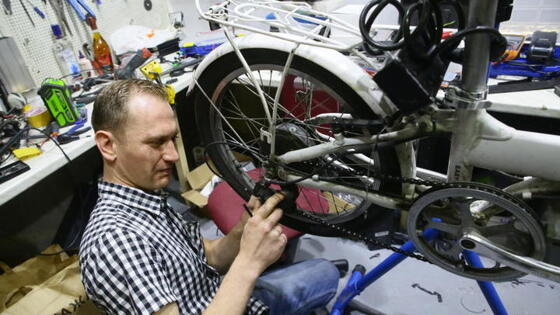 Велосипед в Москве — транспорт достаточно популярный. И в школу можно на нем, в институт, или на работу... Велосипедисты теперь едут с комфортом — есть велодорожки, аккуратные съезды, велопарковки. И как и любому другому транспортному средству, велосипеду требуются обслуживание и ремонт. За этим корреспондент «ВМ» отправился к знакомому мастеру Павлу Сучкову. Веломастерские в столице располагаются обычно в подвале. Вот и мастерская Павла не исключение. Зато большая экономия на аренде и зарплате для персонала. Нет тут ни длинноногих девушек-секретарей, ни учтиво-бесполезных менеджеров в пиджаках и галстуках. Павел — сам себе и бухгалтер, и секретарь. И кофе он в состоянии сделать себе сам, реанимировав в очередной раз видавший виды кофейный аппарат. Внутри мастерская возвращает клиента во времена Виктора Цоя, хотя из динамиков звучит мелодичный блюз, преображающий несколько убогий вид мастерской. Тут же — портрет Би Би Кинга с дарственным автографом. Хозяин мастерской — блюзмен и гитарист. Но я здесь не из-за музыки. — Что чаще ломается в велосипеде? — задаю я приземленный вопрос. — В этом сезоне все больше ломались рамы. У складных велосипедов, — отвечает мастер. — Кто-то думает, что, купив легкий вел, теперь можно будет запросто скакать на нем по бордюрам и ступенькам. Увы. Складной велосипед совсем не создан для экстрима. Хорошо, если рама только треснет. Хуже, если складная рулевая колонка на ходу станет отваливаться... Передаю Павлу свой велосипед, который он ласково обозвал «старина Шульц». История болезни и диагноз: пробег — 17 000 километров, сточены пара ободов, лопнувшие две покрышки, дважды я уже заваривал рулевую колонку, а седло потеряло форму (вешу я почти 90 килограммов). К тому же пора менять все тросы. — Смотрите, Павел, кажется, у меня и передняя покрышка треснула, — указываю я на нарост. Покрышка у меня коричневая, под цвет седла и рулевых ручек. Мастер, осмотрев колесо, радостно восклицает: — А это, батенька, не трещина! Приглядываюсь — действительно, экскремент. Чей именно, сказать не берусь. Большую часть операций по ремонту велосипеда можно сделать, имея при себе лишь складной ключ с шестигранниками. Да еще пара ключей потребуется, чтобы снять педали и втулки. Мой «старина Шульц» (на раме красуется написанная латинскими буквами фамилия известного когда-то велосипедиста) — недорогой складной велосипед для города, оснащенный электродвигателем и батареей. К концу сезона он что-то стал туговато ездить. Павел протягивает мне зубную щетку, которой тщательно прочищаю задние шестеренки. Велосипедисты называют их «звездами. Затем мастер передает мне коробочку с шестеренками и приводом. Надеваю ее на цепь, заливаю внутрь немного уайт-спирита и прогоняю цепь через шестерни и пахучую жидкость. Цепь и «звезды» очищаются. Ловким ударом молотка погнутый переключатель скоростей становится на место. Затем велосипед Павел подвешивает на специальный штатив — так, чтобы оба колеса были на весу. Нужно их выровнять — от ударов перекосило. Чтобы исправить «восьмерку», по указанию Павла подкручиваю ключом по очереди крепления спиц, смазываю тросы, меняю стертые за сезон задние тормозные колодки... Все, велосипед готов! До встречи в следующем сезоне! Я обещаю Павлу, что впредь буду со «стариной Шульцем» более деликатным. Хотя сам я в
