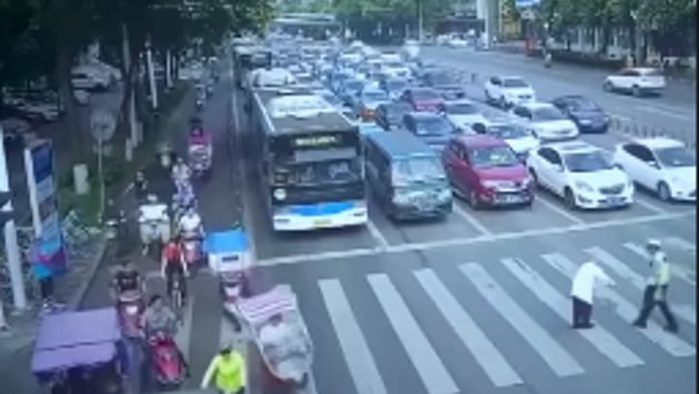 Движение на дороге остановилось из‐за переходившего улицу пожилого человека. Видео