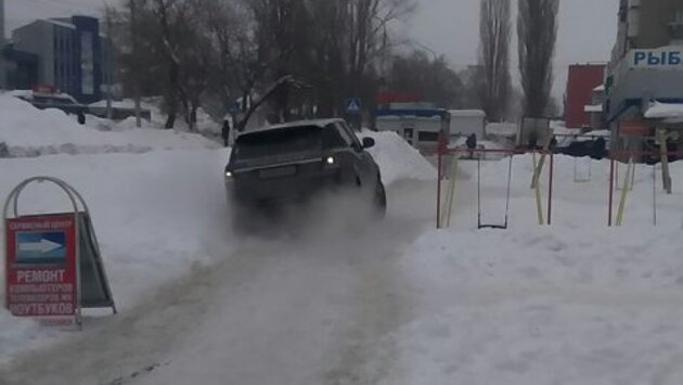 На нечищеной детской площадке в Саратове застрял внедорожник