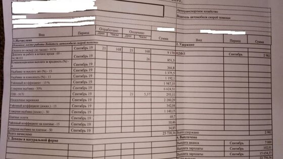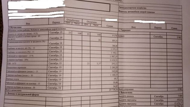 На Станции скорой помощи в Петрозаводске продолжается "итальянская забастовка". Напомним, что она началась 15 сентября и предполагает работу только на одну ставку, в полных бригадах, без подработки, совместительства и работы в свои выходные. Фельдшеры, диспетчеры и водители жалуются на низкие зарплаты. Правда, руководство БСМП карельской столицы утверждает, что средняя зарплата в этом подразделении горбольницы (прим.ред.: сложили всю начисленную зарплату и разделили на количество сотрудников) составляет 48 тысяч рублей. Больница даже опубликовала на своем сайте зарплатную ведомость работников. Она действительно произвела впечатление, потому что встречались суммы, которые превышали 70 и даже 85 тысяч. Но забастовщики тогда с приведенными цифрами не согласились, объяснив, что указанные суммы они получили с учетом многочасовых переработок, которые они вынуждены брать, чтобы прокормить свои семьи. В интервью порталу "Карелия.Ньюс" 29 августа главврач БСМП сказал, что больницу уже много раз проверяли надзорные органы. Мы готовы к любым проверкам. Пусть приходят и смотрят, - подчеркнул Алексей Хейфец. - Прошлой весной некоторые водители говорили, что на бумаге у нас одно, а на деле - другое. Так вот после этого Минздрав проводил проверку, есть справка, подтверждающая это, и реальные цифры. Поверьте, речь идёт не о 18 000 рублей, которые указаны в заявлении как зарплата водителя на ставку". Мы решили проверить это по итогам первого месяца забастовки. 15 октября сотрудники скорой получили зарплату за сентябрь. Смотрим, сколько же получил один из водителей (фото квитка прилагается). Мы попросили работника прокомментировать эти цифры, так как разобраться во всем этом непросто. За сентябрь вышло 22756 (в графе "Всего выплат"). Что сюда входит? Доплата за носилочные переноски , а это - дополнительная работа у водителей, в размере 2280, на эту цифру ещё надо накрутить 65% (северные и районные надбавки) и того - 3762 рубля. Но так как сумма на ставку не должна включать дополнительный заработок, эту сумму вычитаем из общей: 22756 - 3762 = 18994 рубля. Это - зарплата на ставку", - пояснил сотрудник Станции скорой помощи. Выходит, что водители говорили правду, когда жаловались на низкую зарплату? Разбираемся дальше. Тогда в интервью редакции "Карелия.Ньюс" Алексей Хейфец сказал, что средняя зарплата фельдшера на ставку - примерно 35 тысяч рублей. Проверим, сколько получил один из участников "итальянской забастовки" за минувший месяц. Но сразу отметим, что человек, предоставивший нам свой квиток, отработал больше, чем на ставку, так как забастовка началась с середины месяца, то есть только с 15 числа прекратились подработки и совместительство. "Сумма за сентябрь в графе "Всего выплат" - 32 тысячи. Аванс составил 9 тысяч рублей. Далее указана сумма 2469 - её сразу вычитаем, т.к. это был перерасчёт за неиспользованные дни отпуска. Следующая выплата зарплаты - 20 532 , эту сумму считаем. В итоге: за сентябрь на ставку с небольшой переработкой - 29530 рублей, но сюда вошла оплата за работу в неукомплектованной бригаде (это когда работает один фельдшер), на эти 2507 ещё 65% (северные и районный коэффициент). Итог - 4136 рублей. Напомним, что при работе на ставку не должно быть никаких совместительств, а тут человек выполнял работу за себя и за того парня, как говорится. Таким образом, зарплата на ставку с перерабо