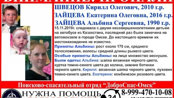 Омский поисково-спасательный отряд Доброспас опубликовал информацию о розыске целой семьи. Альбина Зайцева 1990 года рождения, ехала на автобусе из Казахстана вместе с 9-летнем Кириллом Швецовым и 3-летей Екатериной Зайцевой из Казахстана. В последний раз семью видели на омском автовокзале. Где они находятся сейчас - неизвестно.