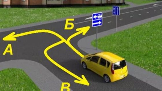 Сегодня вам предстоит разобраться в запрещенных траекториях движения для желтого автомобиля. Постарайтесь максимально быстро ответить на вопрос:"Какая из предложенных траекторий запрещена?" Варианты ответов: "А" и "В"; "Б" и "В"; только "А"; только "В"; "А" и "Б"; у желтого автомобиля нет ограничений по направлениям. Внимательно изучите предложенную картинку и определитесь с ответом. Мы же пока будем анализировать увиденное. Перед нами не совсем обычный перекресток Т-образного вида с выездом на полосу для маршрутных ТС и полосой одностороннего движения. Об этом нам сообщают дорожные знаки. Теперь определимся непосредственно с траекториями. Налево (по направлению "А") поворачивать нельзя, т.к. мы попадаем на полосу маршрутных ТС. Поворот направо - разрешается. Что до разворота (траектория "В"), то в правилах такой маневр не запрещается. Следовательно нам остается констатировать, что запрещена только траектория "А". А как вы определились с решением данной задачи? Поделитесь своими мыслями в комментариях.