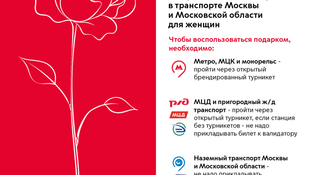 8 марта проезд в общественном транспорте Москвы и Подмосковья, а также в электричках будет для женщин бесплатным. Такое решение приняли Мэр Москвы Сергей Собянин и губернатор Московской области Андрей Воробьев. На станциях метро и Московского центрального кольца появятся украшенные к празднику турникеты. Они будут открыты в течение всего дня, женщины смогут проходить не прикладывая билет к валидатору. На наземном транспорте москвички и жительницы Подмосковья также могут не оплачивать проезд — штраф за это взиматься не будет. На железнодорожных станциях некоторые турникеты будут открытыми. В местах, где нет турникетов, пассажирки смогут сразу проходить на перрон и не прикладывать билет к валидатору. Кроме того, 8 и 9 марта парковка в Москве будет бесплатной.