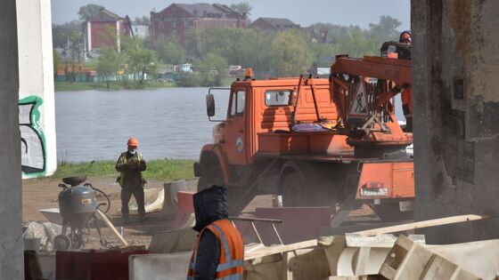 Рабочие резко ускорились во время ремонта моста через реку Кострома