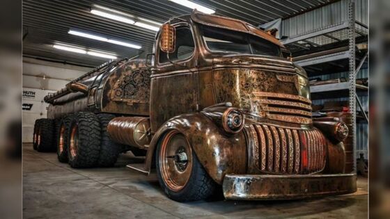 Этот здоровенный танкер на колесах, словно возникший из постапокалептического фильма, создан вовсе не для того, чтобы перевозить в больших цистернах дизельное топливо или бензин. Этот проект создали энтузиасты кастомайзинга из мастерской Haük Designs. Команда Кенни Хаука специализируется на создании подобных фантастических внедорожников, в которых невероятным образом сочетается крайне необычный дизайн и строгая функциональность. В этом случае «подопытным кроликом» стал грузовик с полуприцепом, точнее, древний топливозаправщик, созданный в 1946 году. Теперь же этот уникальный танкер обеспечит отменным крафтовым пивом крупное мероприятие. Кенни Хаук уверяет, что «пивовоз» может перевозить, а также хранить 14 кег бодрящего напитка. Под капотом тягача находится 5,9-литровый турбодизель Cummins, работающий в паре с «автоматом» Alison CA Conversions. Кабина тягача выполнена в рэт-родовской тематике, где кожаные кресла перекликаются с хромированными деталями в отделке.