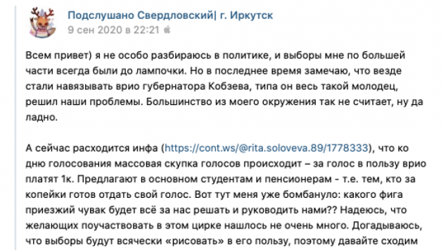МОСКВА, 11 сентября. /ТАСС/. Информация о том, что в Иркутской области якобы идет голосование на выборах из багажника автомобиля, является недостоверной. Об этом заявил в пятницу председатель координационного совета при Общественной палате РФ по общественному контролю за голосованием Максим Григорьев. "В Иркутской области распространялась информация о том, что якобы идет голосование в багажнике автомобиля. На самом деле мы проверяли эту ситуацию, ни о каком голосовании в багажнике автомобиля речи не идет. Туда убрали переносную урну", - сказал Григорьев. По его словам, пользуется популярностью прием, когда отдельный кадр пытаются представить в качестве нарушения. "Такой поток фейков идет", - сказал Григорьев. Единый день голосования пройдет 13 сентября, 11 и 12 сентября предусмотрено досрочное голосование. Выборами разных уровней в этом году будут охвачены 83 субъекта РФ. По информации ЦИК РФ, по итогам 9 038 избирательных кампаний должны быть замещены 78 363 депутатских мандата и выборные должности.