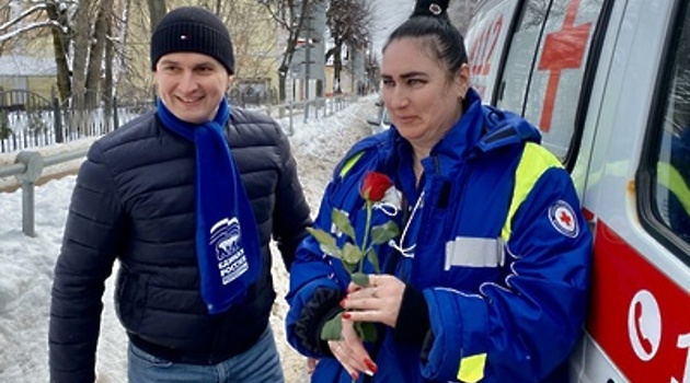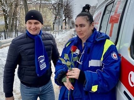 В Клину сотрудники ГИБДД и певец Владимир Политов остановили подарили врачам цветы