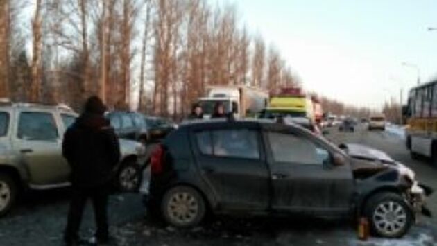ДТП произошло утром в среду, 25 января, на юго-западной окружной дороге Ярославля. У деревни Чурилково столкнулись четыре иномарки – «Рено Дастер», «Рено Сандеро», «Пежо» и «Форд Фокус». Водитель последней, по предварительным данным, стал виновником аварии, выехав на встречную полосу. Для ликвидации последствий дорожно-транспортного происшествия прибыли «скорая», спасатели и ГИБДД. Автомобили получили механические повреждения. В результате аварии травмы получили два человека – водитель и пассажир «Сандеро». Детали происшествия выясняются.