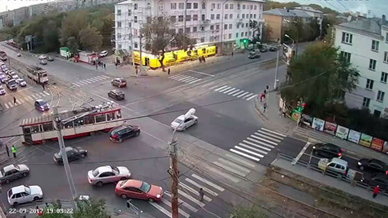 В Челябинске сошедший с рельсов трамвай перекрыл полосу движения. Трамвай сошел с рельсов на пересечении улицы Российской с проспектом Победы в Челябинске, сообщает ГТРК Южный Урал . Авария произошла вечером 22 сентября. Совершая левый поворот, трамвай сошел с рельсов. Он перекрыл почти всю полосу движения, поэтому автомобилям пришлось его объезжать. Отмечается, что заявка на ремонт стрелки была отправлена еще 21 сентября, однако только после схода вагона ее решили починить. Спустя час после инцидента трамвай поставили на рельсы.