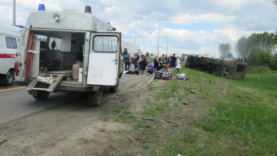 В сети появился ролик с места столкновения микроавтобуса и КамАЗа на трассе "Дон" в Тульской области, передает телеканал "360". На видео показано, как пассажиров выводят из микроавтобуса. Кроме того, на кадрах видно, что большегруз в результате столкновения съехал с обочины и перевернулся. Авария на трассе "Дон" произошла в воскресенье, 18 июня. По не подтвержденным данным, погиб один человек. Местная полиция сообщила о семи пассажирах микроавтобуса, получивших ранения.