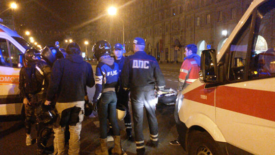 ДТП произошло в ночь на четверг на пересечении улицы Энгельса и проспекта Независимости. Мотоцикл Honda врезался в автомобиль скорой помощи. В результате травмы получил водитель спортбайка, бригада медиков доставила его в больницу. На кадрах, которые сняли очевидцы происшествия, виден разбитый в аварии мотоцикл и сотрудники ГАИ, которые осматривали место происшествия. Также другой байкер передал слова пострадавшего мотоциклиста, который рассказал, что ехал на "зеленый", в то время как скорая двигалась на "красный" причем без проблесковых маячков. Согласно предварительной версии, озвученной ГАИ Мингорисполкома, мотоциклист проехал через перекресток на запрещающий сигнал светофора. Для того, чтобы установить причины ДТП, будут изучены записи с камер видеонаблюдений, которые могли записать факт дорожного инцидента.