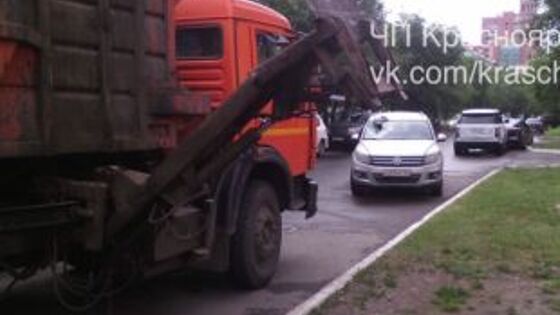 Фото опубликовали очевидцы в соцсетях. Как сообщают свидетели, первая авария произошла в районе переулка Якорный. Водитель мусоровоза забыл поднять лапу манипулятора, и зацепил припаркованный «Volkswagen». Он протащил авто несколько метров, разбил стёкла и примял заднюю часть машины. Вследствие этого, ударились друг об друга припаркованные «Range Rover» и «Mercedes». К счастью, обошлось без пострадавших. Почти в это же время стало известно, что в центре Красноярска на улице Кирова, мусоровоз застрял, выезжая из арки жилого дома. Он зацепил сверху рекламную конструкцию, и перекрыл выезд со двора.
