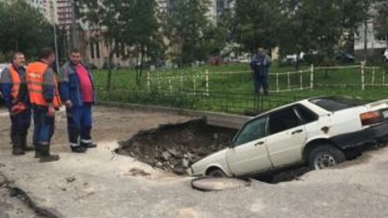 Автомобиль провалился под землю после прорыва трубы на Кораблестроителей