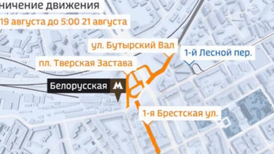 19-20 августа на нескольких улицах в районе Белорусского вокзала в Москве будут менять асфальт, передает телеканал "Россия 24". В связи с этим с полуночи 19 августа до пяти утра 21 августа для проезда автомобилей закрыли площадь Тверская Застава, участок Бутырского вала и 1-й Брестской улицы. При этом сквозной проезд по Тверской-Ямской сохранился. Кроме того, в субботу, воскресенье и понедельник с часу ночи до пяти утра машины не будут пропускать по участкам Грузинского вала и 2-й Брестской.