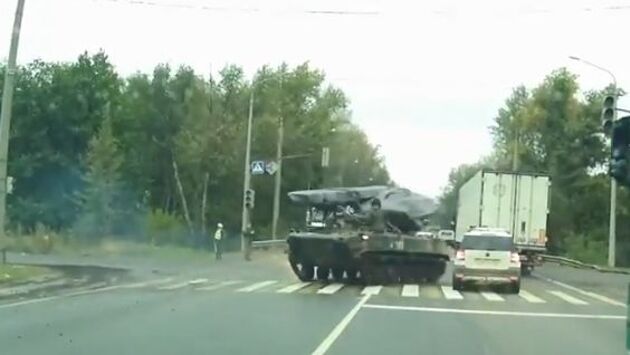 Механик-водитель боевой машины не справился с управлением на повороте и снес легковое авто с трассы. Инцидент произошел 28 августа в Рязанской области. На записи видеорегистратора, заснявшего произошедшее, видно, как БТР на скорости не сумел вовремя развернуться на свою полосу. Информации о пострадавших в результате ЧП нет.