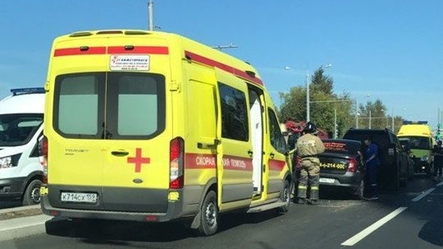 Трое пострадавших. Днем 31 августа 2017 года в Перми на шоссе Космонавтов 32-летний таксист на Renault Logan протаранил попутный Land Cruiser Prado, который от удара отбросило на Mazda. Как сообщили "Уралинформбюро" в пресс-службе ГУ МВД по Пермскому краю, у виновника аварии не было прав. От освидетельствования на состояние опьянения он отказался. Пострадали три пассажира такси - 32-летняя женщина и мужчины 35 и 43 лет. "Я мимо проезжал дак там в такси весь салон в крови", "Голова пассажира в лобовом побывала", - пишут очевидцы в соцсети "ВКонтакте" (орфография и пунктуация автора, - прим.ред.). По факту аварии проводится проверка. Фото: ЧП ДТП Пермь | vk.com