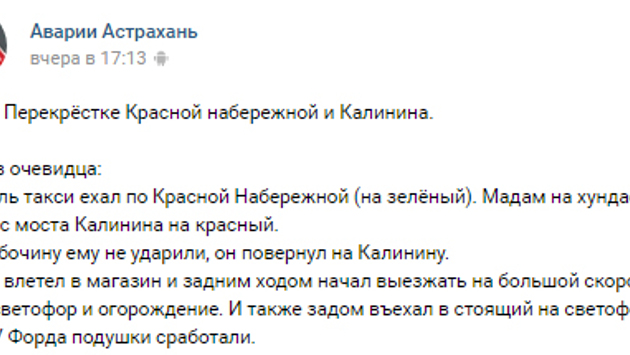 Накануне на пересечении улиц Калинина и Красной Набережной произошло ДТП с участием внедорожника Hyundai и автомобиля службы такси. Сообщение о происшествии появилось в региональном интернет-сообществе "Аварии Астрахань" социальной сети "Вконтакте". Как сообщают свидетели с места аварии, владелица Hyundai совершила проезд на запрещающий сигнал светофора, в результате чего столкнулась с машиной службы такси. От удара виновница влетела в магазин, после чего сдала задом и снесла светофор,отмечают очевидцы. На фото с места инцидента хорошо видно, что обе машины получили механические повреждения передней части. Также нашему изданию стало известно, что на месте происшествия работала бригада скорой медицинской помощи. На данный момент информации о состоянии здоровья пострадавших не имеется. Работники ГИБДД города данный инцидент официально не комментировали.