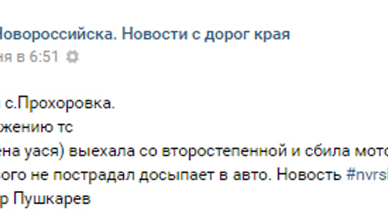 В районе села Прохоровка города-героя Новороссийска произошло серьезное ДТП с участием мотоциклиста и автомобиля ВАЗ-2107. Сообщение о происшествии появилось региональном интернет-сообществе "ДТП Новороссийска. Новости с дорог края " социальной сети «Вконтакте». Со слов пользователей группы, автомобилист не предоставил преимущество в движении байку, который двигался по главной дороге, вследствие чего произошло столкновение. В результате удара мотоцикл отбросило на несколько десятков метров от места ДТП. Как стало известно «Politema.ru», владелец “семерки” не пострадал, и после аварии спокойно уснул в салоне своего автомобиля. О судьбе пилота спортивного байка ничего неизвестно. Над инцидентом работают сотрудники дорожной полиции.
