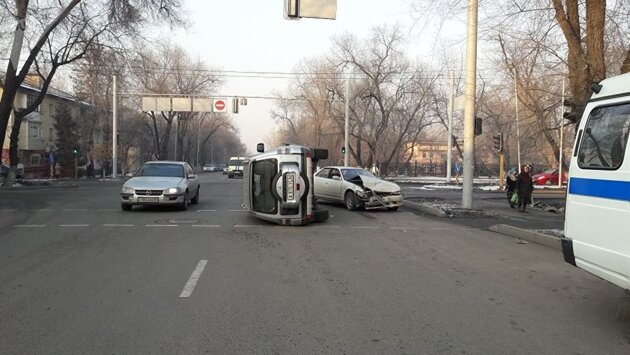 Внедорожник перевернулся после столкновения с легковушкой в Алматы