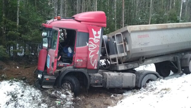 Под Выборгом песковоз вылетел в кювет после столкновения с легковушкой