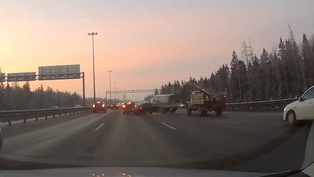 Утром в четверг, 1 февраля, на КАД в Санкт-Петербурге произошла авария, в которой приняло участие пять "разнокалиберных" транспортных средств. На записи, сделанной регистратором, видно, что водитель Лады не справился с управлением и его машину занесло. Через несколько секунд "Приора" протаранила "Газель" и грузовик, ехавшие правее. Также, по словам очевидцев, небольшие повреждения получили две легковушки. По предварительной информации, в результате ДТП никто из его участников серьезно не пострадал.