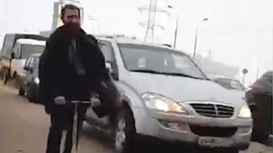 С одной стороны, "водителю" явно приходится нелегко - колеса его самоката буксуют в снежной каше. С другой стороны, он едет быстрее, чем завтрявшие в пробке автомобилисты. Отдельного внимания заслуживает выдержка, с которой он героически отказывается от помощи соседей по потоку и игнорирует шутливые комментарии.