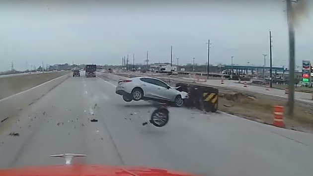 Двойная авария с участием фуры и легковушки произошла в минувший понедельник, 5 февраля, неподалеку от города Розенберг на юге США. Водитель легкового автомобиля по неизвестной причине отвлекся от управления транспортным средством и с большой скоростью врезался в придорожное ограждение. На этом его злоключения не закончились. Ехавшая позади фура не успела уклониться от столкновения и как следует "добавила" легковушке, отправив ее в "полет", после чего грузовик врезался в бетонный "отбойник" и остановился. Все участники инцидента остались живы.