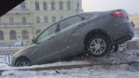 «Лада» застряла на поребрике у Поцелуева моста в Петербурге