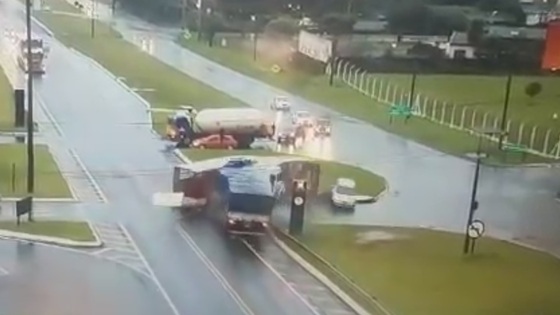 В сети размещены кадры массового ДТП, произошедшего утром 28 февраля на трассе около города Каскавела в штате Парана на юге Бразилии. Водитель пассажирского автобуса решил пересечь шоссе, однако по какой-то причине не заметил грузовик, находившийся справа от него. Большегруз протаранил маршрутное транспортное средство, после чего оба автомобиля оказались за пределами проезжей, попутно задев легковушку и подмяв под себя мотоцикл, водитель которого проявил завидную ловкость и умудрился выскочить из-под автобуса буквально в самый последний момент. По сообщениям СМИ, в результате инцидента одиннадцать человек получили травмы различной степени тяжести.