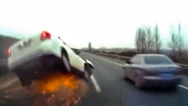 Герой ролика очень старался обогнать одну из машин, но потерял контроль над автомобилем. Дальше последовал удар о ограждение, "полет" с искрами и столкновение с еще одной машиной. По информации местных СМИ, никто не пострадал.