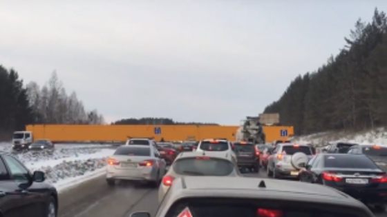Автомобилисты сняли на видео гигантский грузовик, который перегородил обе полосы движения на трассе «Челябинск – Екатеринбург». Челябинцы обсуждают в социальных сетях нестандартно длинное транспортное средство, которое создало огромную пробку на трассе из города. Происшествие случилось ещё 2 марта. Фура с жёлтым прицепом, длинной как минимум 70 метров, создала затор для всех трёх полос в сторону Екатеринбурга. Аналогичная ситуация произошла с движением и по встречной полосе. Судя по всему, водитель грузовика, хотел развернуться и поехать обратно, но не рассчитал размеры транспортного средства. Автомобилисты гадают, что это была за машина со столь негабаритным грузом. Некоторые предположили, что это часть крана, и даже припомнили, что такие изготавливают на Магнитогорском крановом заводе. При этом водители легковушек в недоумении, почему перевозку гигантского прицепа не сопровождала патрульная машина с сиреной и проблесковыми маячками.