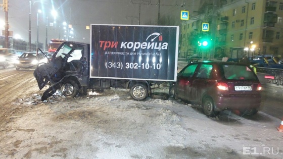 Сегодня вечером на перекрестке улиц Репина и Крауля столкнулись три машины: грузовичок и легковушка Hyundai, и Daewoo Matiz. Как рассказали очевидцы, водитель грузовика ехал по улице Репина в направлении Малышева, а легковушка ехала во встречном направлении. — Водитель легковушки пояснил, что грузовичок вынесло на встречную полосу, а от столкновения с легковушкой его отбросило на Daewoo Matiz, который остановился на перекрестке, — сообщили в ГИБДД по Екатеринбургу. — Водителю грузовичка оказали медицинскую помощь. Пострадавшего водителя пришлось вытаскивать из машины спасателям. Ему сильно зажало ногу. После того, как сотрудники МЧС освободили его, медики увезли мужчину в больницу. Движение на перекрестке было сильно затруднено.