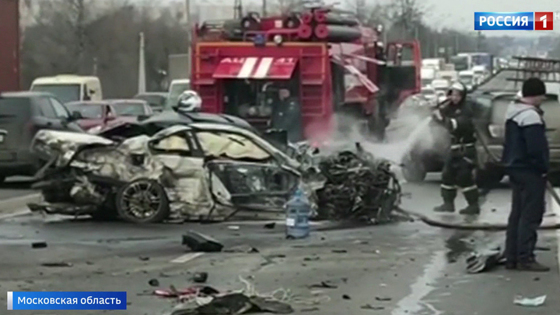 Массовое ДТП на Ленинградском шоссе: в районе съезда в сторону аэропорта Шереметьево столкнулись пять машин. Два человека пострадали. По словам очевидцев, аварию спровоцировал водитель BMW, который решил "поиграть в шашечки" на высокой скорости. В сторону центра Москвы из области тянется многокилометровая пробка, в сторону области — тоже пробка. ДТП почти растащили, но движение пока не восстановилось. Место аварии присыпали специальным реагентом: на дороге разлилась бензин. Картина ДТП страшная, но, к счастью, никто не погиб. Столкнулись три легковые машины и две фуры. Пострадали два человека. У водителя одной из фур травмы несерьезные, а вот водителя белой BMW увезли на скорой. Автомобиль — всмятку, на лобовом стекле — следы огнетушителя. После столкновения машина загорелась, двери заблокировало. Пострадавшего доставали через заднее стекло. По словам других участников ДТП, именно он и спровоцировал аварию. — Выскочил поперек, его занесло, с заносом ушел в фуру. Он был зажат, его достали и увезли на скорой помощи в больницу. Пострадали только два человека: водитель фуры и водитель BMW. — Шашечками, да, он обгонял. Ну — он себя вел неадекватно, я так скажу просто. Как говорят, очевидцы, мужчина в возрасте около 30 лет ехал с большой скоростью, на дороге вел себя неадекватно. По нашей информации, автомобиль ему не принадлежит. — Пока что еще не известно, он был за рулем, не он был за рулем. Утром встали — машины нету! Понимаете, мне тоже позвонили. Мы вообще без понятия! "По предварительным данным, водитель автомашины BMW не справился с управлением и совершил выезд на дорогу, предназначенную для встречного движения, где произошло столкновение с грузовым автомобилем. В свою очередь, грузовой автомобиль также выезжает на полосу встречного движения и происходит столкновение еще с другим грузовым автомобилем. Машина BMW после удара отлетает и происходит столкновение еще с двумя легковыми автомобилями", — рассказал врио заместителя командира 4 СБ ДПС ГИБДД по г. Москве Александр Рудковский. Полиция начала административное расследование. На месте работают сотрудники ЦОДД и дорожной инспекции. Одну полосу движения заняла фура — у нее оторвало кабину. В машине перевозили воду, бутылки рассыпались по дороге. Сейчас дорожные службы освобождают проезжую часть.