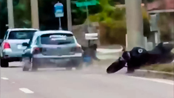 По предварительным данным, конфликт начался из-за того, что автомобилист выбросил мусор из окна и тот попал по шлему мотоциклиста. После чего последний поравнялся с машиной и начал ругаться со своим оппонентом. К несчастью, автомобилист оказался не слишком сдержанным. В какой-то момент, после того как пилот мотоцикла попытался сбить зеркало заднего вида с машины, водитель Mazda 3 резко сдает вправо и сбивает мотоциклиста на обочину, а затем спокойно уезжает с места аварии. По данным местных СМИ, сейчас полиция ищет виновника аварии. Мотоциклист попал в больницу, у него сломано несколько ребер. В интервью журналистам он заявил, что хочет справедливости. Но не можем не отметить, что зеркало у машины первым пытался сбить именно он. Не стоит быть слишком агрессивным, когда противник весит в нескольо раз больше тебя.