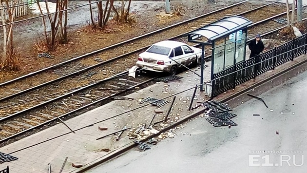 На ВИЗе легковушка снесла дорожное ограждение и перегородила трамвайные пути