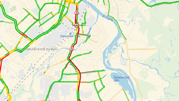По данным сервиса Яндекс.Карты, утром на дорогах Пензы образовались большие пробки. На въезде в город не удастся быстро проехать на пересечении улицы Измайлова и улицы Антонова – средняя скорость движения транспортного потока на этом участке составляет 7 км/ч. Также немного затруднено движение на Транспортной улице при выезде на Бакунинский мост и после моста им. ФУ БХУХО. Заторы образовались на улице Гагарина на перекрестке с улицей Леонова – движение затруднео в обоих направлениях. В центре города автомобилисты стоят в пробке на улице Пушкина в направлении центра города, а также на пересечении улицы Суворова и Толстовского путепровода. Не удастся быстро проехать и в районе Центрального рынка. Небольшая пробка скопилась на улице Карпинского при движении в сторону проспекта Победы – средняя скорость на этом участке составляет 10 км/ч. Огромная пробка образовалась на улице Терновского при движении в сторону центра города. длина затора составляет более трех с половиной километров, а скорость движения не превышает 5 км/ч. По возможности планируйте маршруты объезда. Также парализовано движение и на всех прилегающих улицах – Петровской, Сухумской и Ростовской. Дорожно-транспортное происшествие на улице Баумана привело к возникновению затора. Инцидент произошел в районе пересечения с проездом Баумана.