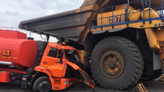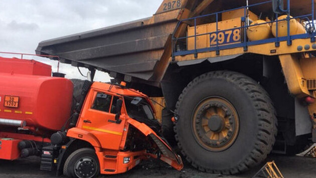 В Кузбассе женщина на "БелАЗе" случайно раздавила бензовоз и получила штраф в 500 рублей