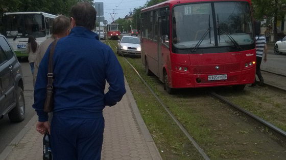 Пятёрка встала в пробке: маршрутки и машины едут по трамвайным путям