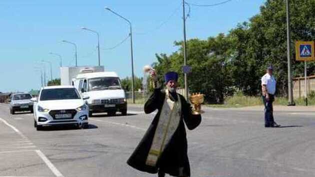 В Ейском районе в начале курортного сезона освятили наиболее аварийные участки. Автодороги окропил святой водой руководитель епархиального отдела по взаимодействию с правоохранительными органами (есть в церкви и такая должность) протоиерей Василий Козаченко. В мероприятии также были задействованы сотрудники ГИБДД. Они перекрывали движение на несколько минут, пока священнослужитель проводил обряд. Были освящены несколько оживленных улиц в самом Ейске, а также участки трассы Ейск-Должанская и Ейск-Камышеватская.
