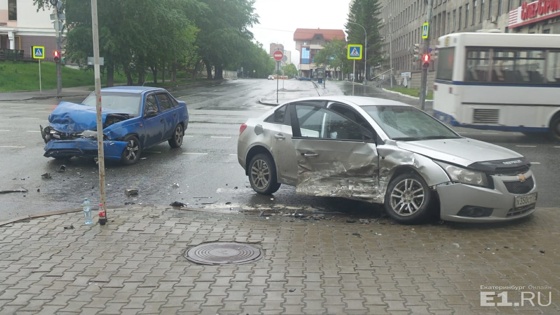 Воскресным утром на практически пустой улице Малышева не поделили дорогу Chevrolet и Daewoo Nexia. В результате аварии пострадал один человек. — Chevrolet делал левый поворот с Малышева на Мамина-Сибиряка в направлении зоопарка, а Nexia ехала ему навстречу и протаранила Chevrolet в бок, — рассказал очевидец. На место происшествия приехали автоинспекторы, пожарные и медики. Двое мужчин, ехавших в Daewoo Nexia не пострадали, несмотря на то, что автомобилю разнесло всю переднюю часть. Единственным, кому понадобилась помощь врачей оказался пассажир Chevrolet. С места аварии его увезли в больницу. Если вы также стали свидетелем происшествия, сделали фото и видео или располагаете информацией о пострадавших, пишите нам на электронную почту news@corp.e1.ru. Также можно воспользоваться WhatsApp и Viber — их номер +7 909 704 57 70.