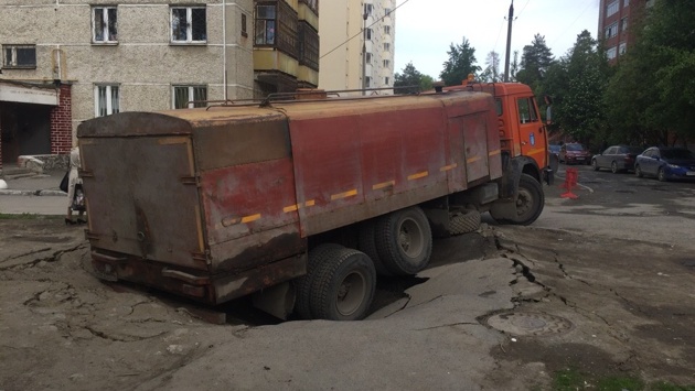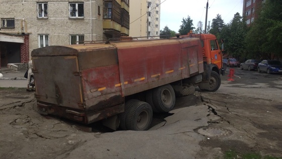 Как рассказал E1.RU очевидец Евгений, грузовик приехал, чтобы промывать трубы канализации и был полон воды. — Видимо, плиты перекрытия канализационного колодца не выдержали и провалились, — говорит Евгений. — Сразу приехал кран Водоканала, сейчас грузовик поднимают, зацепили сзади. Его задняя часть полностью ушла под землю. Это уже второй провал асфальта за сегодня: у магазина «Пятёрочка», который расположен на улице Баумана, под колёсами грузовика провалился асфальт. Тяжёлая машина накренилась и застряла в яме.