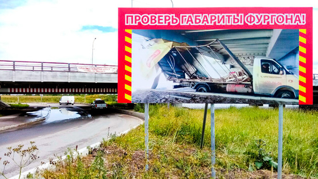 На это раз в ход пошел креативный способ: по пути к путепроводу установили баннеры с фотографиями "жертв" низкого моста. В Сети появились снимки, сделанные у знаменитого "моста глупости" – путепровода на пересечении Софийской улицы и Ленсоветовской дороги. Вдоль дорог появились красочные баннеры со снимками фургонов, застрявших под низкой конструкцией. Напомним, там с 2013 года происходят регулярные аварии с "Газелями": фургоны не проходят по высоте под 2,7-метровым мостом. С того момента, как за аварийным местом начали пристально следить журналисты и пользователи соцсетей, "жертвами" моста стал 151 автомобиль. Как сообщал "Авторамблер", после 150-го происшествия дорожники распорядились об установке новой тарированной рамки с цепями и лежачего полицейского. Однако не прошло и нескольких недель, как очередной фургон "разложился" под мостом.