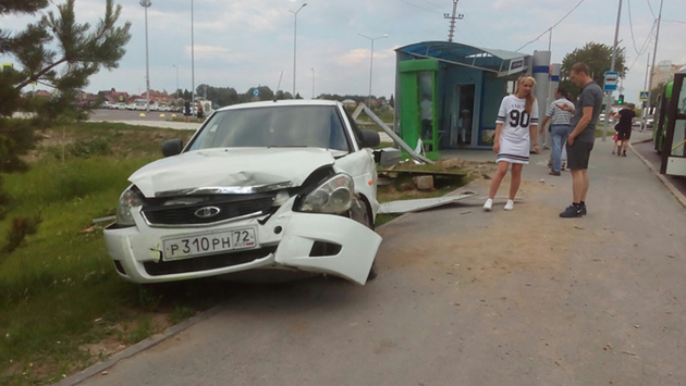 Автомобильный регистратор снял на видео аварию, произошедшую в 2 июля в Тюмени, когда водитель белой "Приоры" не успел вовремя среагировать на маневр поворачивающего на перекрестке автомобиля, потерял управление и врезался в остановку общественного транспорта. От удара строение было полностью разрушено, пострадал и сам автомобиль. Однако водитель и стоявшие неподалеку прохожие не пострадали.