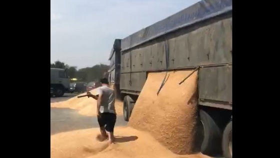 Очевидец снял на видео необычные действия водителя грузовика – утверждается, что запись была сделана на днях около поста ДПС на Батайском кольце под Ростовом. Как сообщают местные СМИ, сотрудники полиции установили, что грузовик, перевозивший зерно, перегружен, и не пропустили его дальше. Мужчина, находившийся за рулем фуры, болезненного воспринял ситуацию и просто разгрузил продукцию прямо на трассе. О том, как развивались события дальше, и кто убирал несколько тонн зерна, оказавшиеся на дороге, не сообщается.