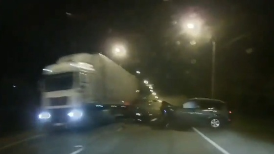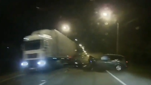 Регистратор запечатлел момент столкновения двух автомобилей, произошедшего в ночь на пятницу, 27 июля, в районе деревши Юшково в Наро-Фоминском районе Московской области на трассе А 107, также известной как Московское малое кольцо или "Малая бетонка". Водитель легковушки пошел на обгон фуры, однако по какой-то причине не рассчитал расстояние до встречного кроссовера, ехавшего перед авто, из которого велась съемка. Несколько мгновения участники движения пытались разминуться друг с другом, однако попытки не привели к желаемому результату и машины столкнулись друг с другом практически лоб в лоб. О пострадавших в результате ДТП пока не сообщается.