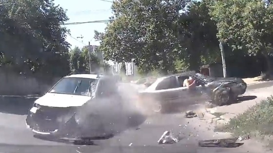 Столкновение легковушек и наезд на человека попали в объектив регистратора очевидца, оказавшегося днем в минувший вторник, 14 августа, на улице Шклярука в Одессе. Водитель не пропустил другое транспортное средство на перекрестке, в результате чего произошло ДТП. После этого один из участников аварии вылетел за пределы проезжей части и совершил наезд на продавщицу магазины, вышедшую на перекур. Судя по кадрам видео, женщину практически припечатало автомобилем к стене постройки. По предварительной информации, все "действующие лица" этого ролика отделались сравнительно легкими травмами.