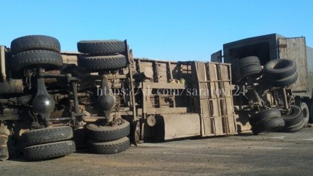 На пересечении Вольского тракта с Саратовской кольцевой автодорогой перевернулся грузовик КамАЗ с полуприцепом, везший арбузы. Фотографии с места происшествия сегодня, 23 сентября, опубликовал в группе «Саратов онлайн» ВКонтакте пользователь Валерий Резников. На фото, снятых из проезжавшего мимо автомобиля, виден лежащий на боку грузовик. Из фуры рабочие перекладывают арбузы в подъехавший большегруз. По предварительным данным, в результате аварии никто не пострадал, подробности происшествия уточняются.